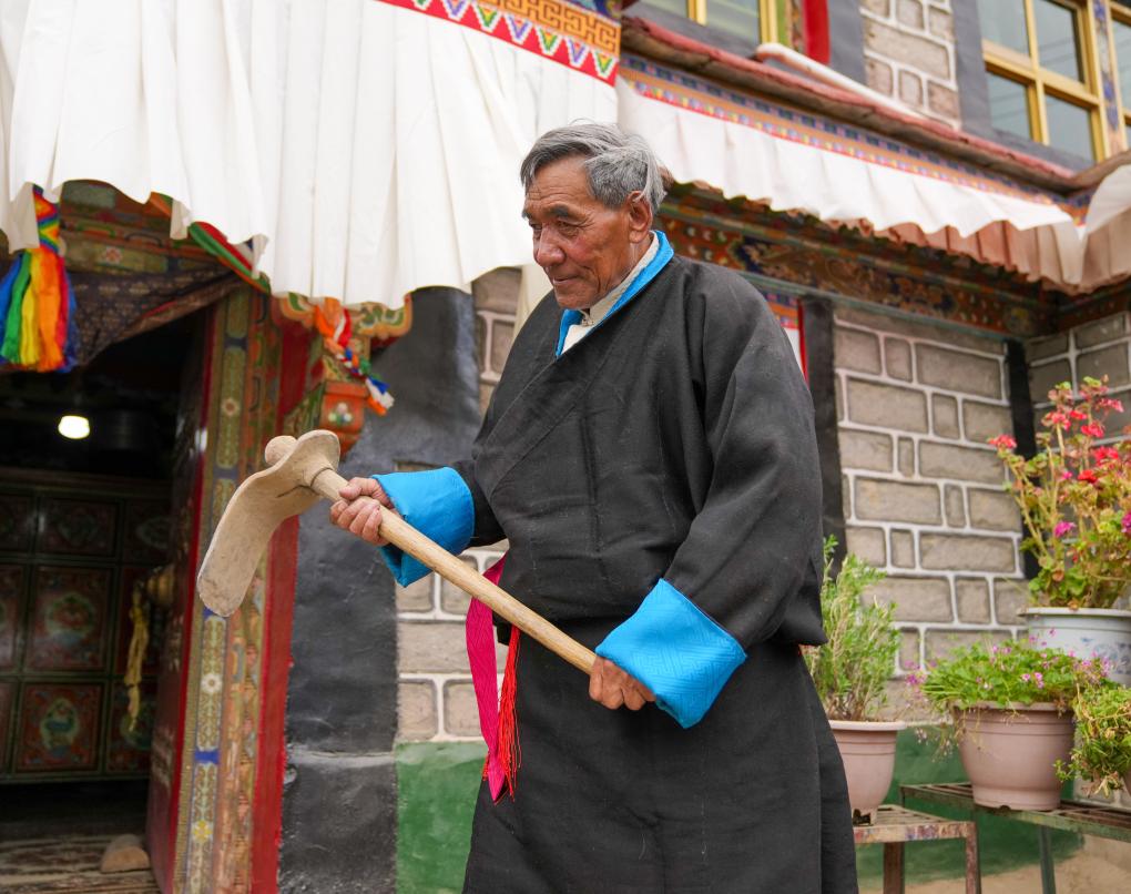 達瓦片多展示當農(nóng)奴時使用過的農(nóng)具(3月12日攝)。