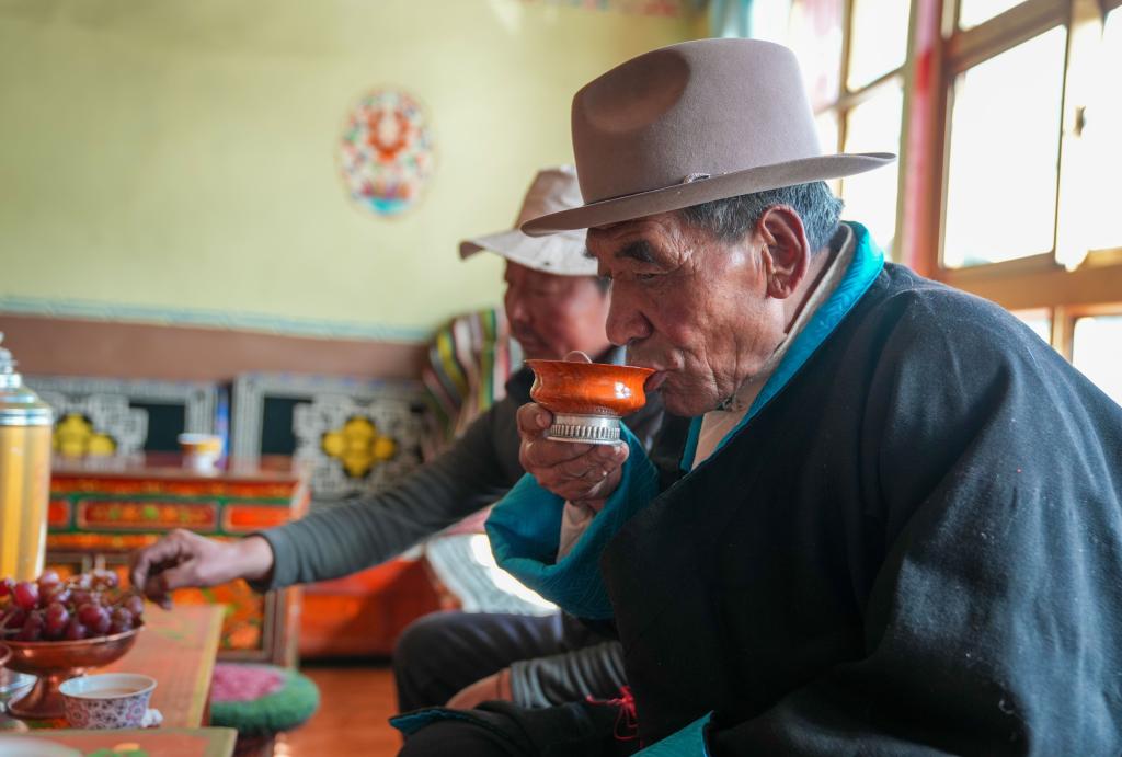 達瓦片多在家中喝酥油茶(3月12日攝)。