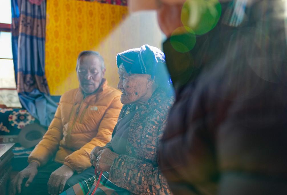 貢覺曲珍(中)和家人在家中聊天(3月6日攝)。