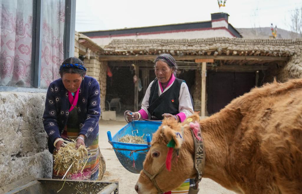 普珍(右)和兒媳在喂牛(3月12日攝)。