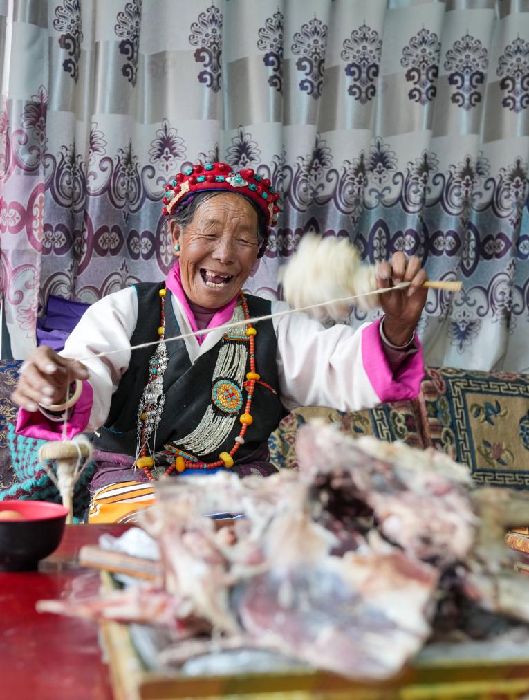 普珍在家紡羊毛線(3月12日攝)。