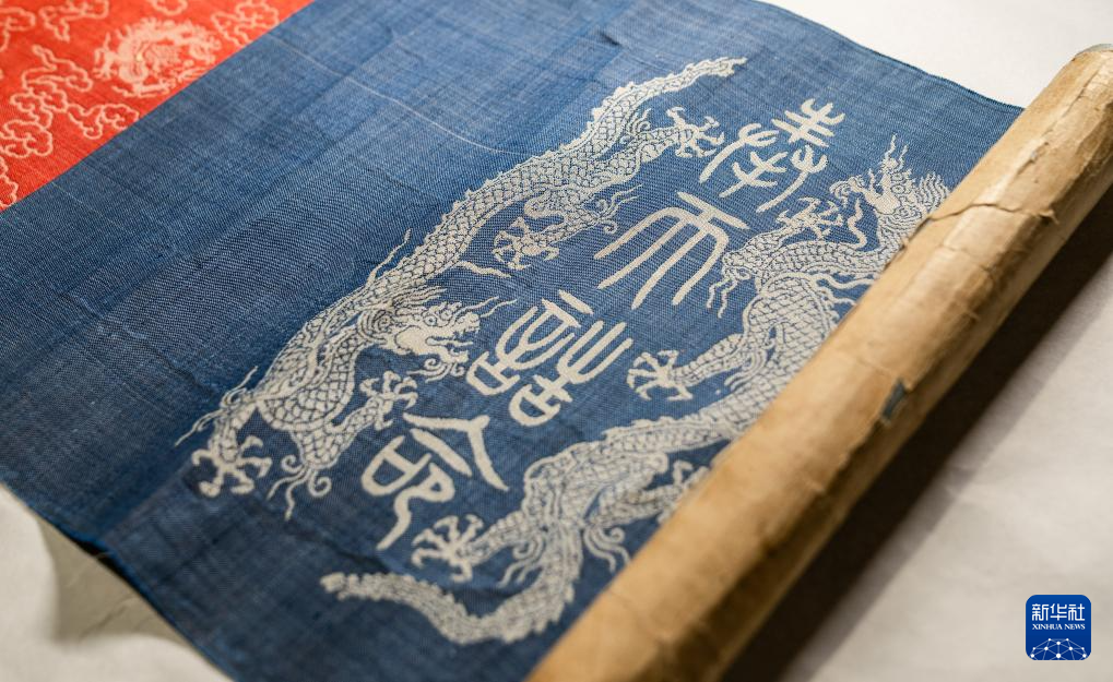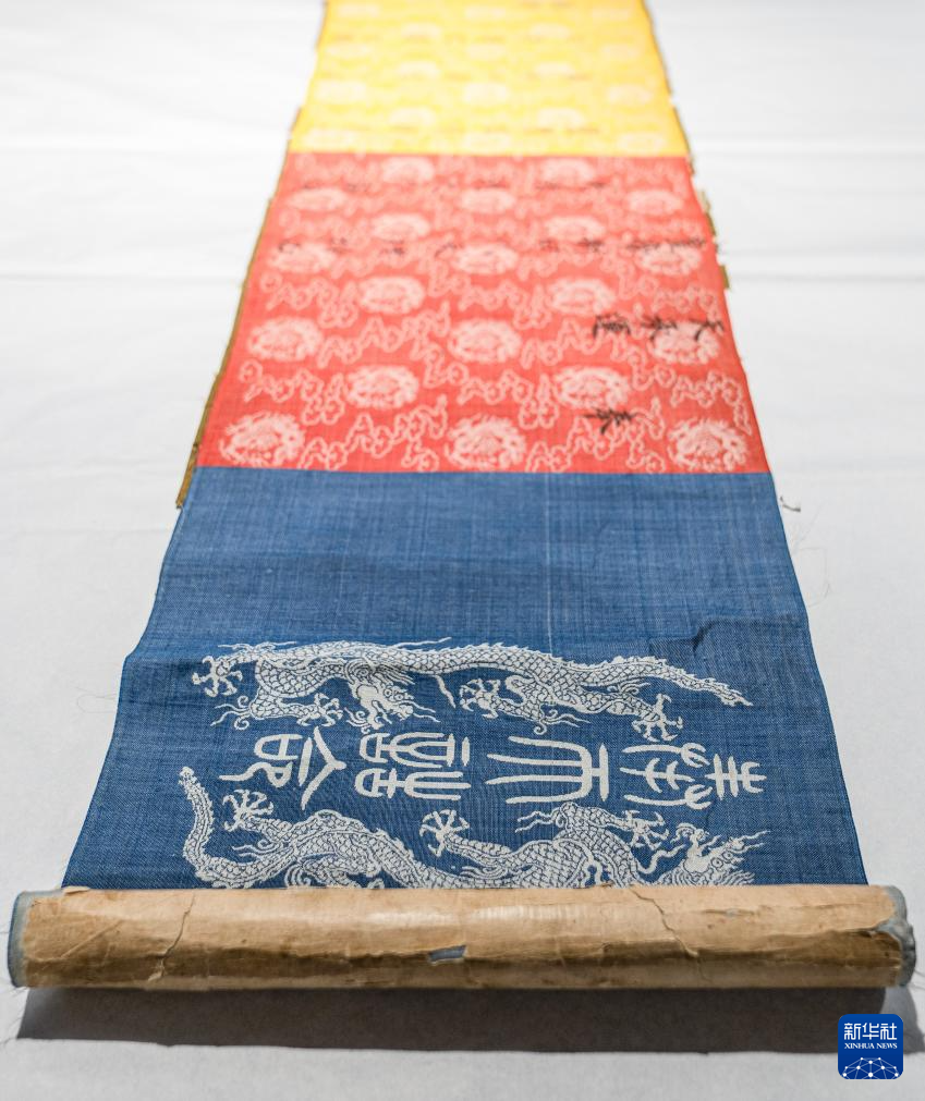 ?這是《永樂十一年封斡喃渴烈思巴為輔教王誥書》卷首(5月20日攝)。篆書“奉天誥命”四個字和雙龍圖案均是錦緞織造時應(yīng)用提花技術(shù)以不同色彩的絲線織成。新華社記者 李賀 攝