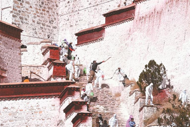 10月22日,拉薩布達(dá)拉宮迎來一年一度的粉刷季,人們手持工具,將涂料逐層涂刷在布達(dá)拉宮墻上。據(jù)了解,布達(dá)拉宮刷墻涂料主要以白灰、紅土和黃土等天然原料為主,為了增加光澤和黏度,調(diào)配過程中還會(huì)添加少量的牛奶、白糖、蜂蜜、藏紅花和牛骨膠等,讓涂料更好地附著在墻體上,為布達(dá)拉宮的墻體增添一層保護(hù)。記者 洛桑 唐斌 攝影報(bào)道