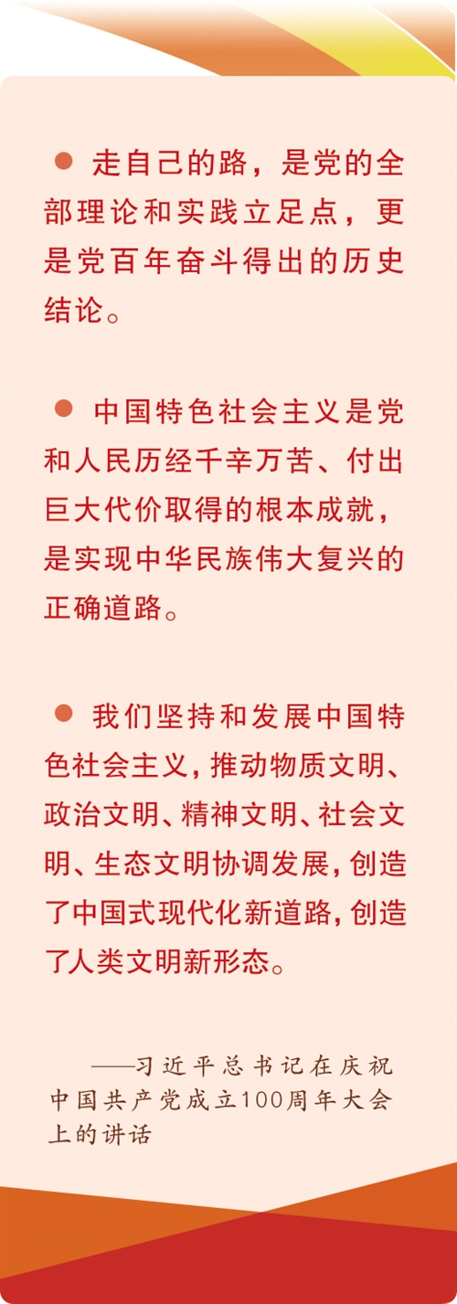 習近平總書記在慶祝中國共產黨成立100周年大會上強調,“以史為鑒、開創(chuàng)未來,必須堅持和發(fā)展中國特色社會主義”“我們堅持和發(fā)展中國特色社會主義,推動物質文明、政治文明、精神文明、社會文明、生態(tài)文明協(xié)調發(fā)展,創(chuàng)造了中國式現代化新道路,創(chuàng)造了人類文明新形態(tài)”。