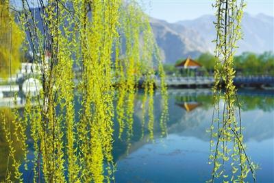 吐露新芽的柳枝掩映著慈松塘公園的湖水。格桑吉美 攝