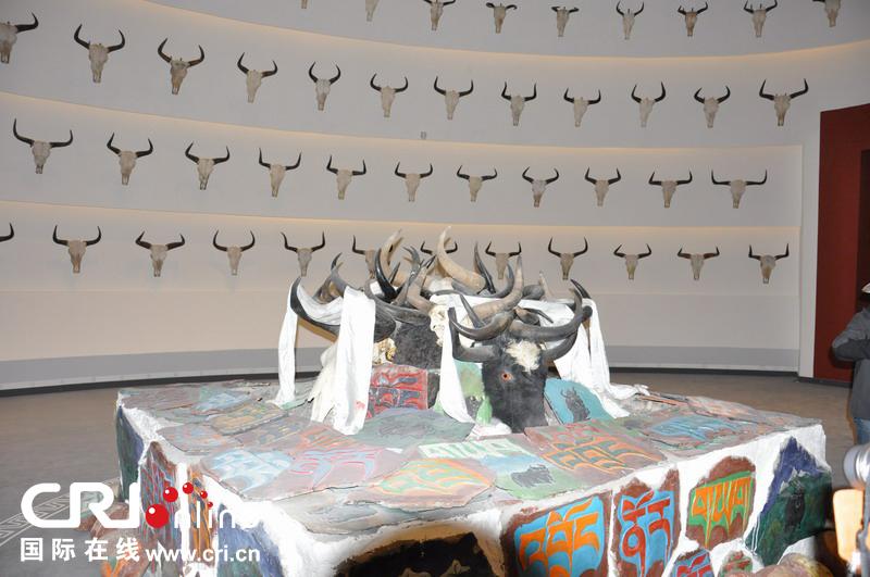 西藏牦牛博物館一共分四個廳:感恩牦牛、探秘牦牛、相伴牦牛、靈美牦牛。十世班禪大師生前說過:“沒有牦牛就沒有藏族”,深刻地揭示了牦牛與藏族密不可分的關系。感恩牦牛展廳運用轉經(jīng)筒、牦牛頭骨、瑪尼堆、場景畫、壁畫等形式,表達了藏族人民對牦牛的感恩和崇敬。圖為感恩牦牛展廳中的展品--自然死亡的野牦牛頭部。圖片來源:國際在線