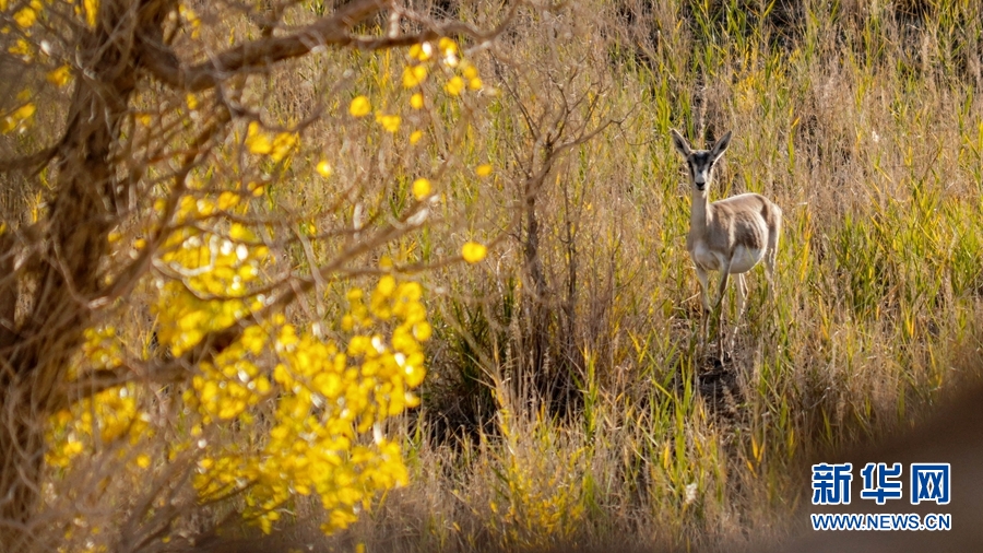 一只鵝喉羚在胡楊林內(nèi)活動(dòng)。新華網(wǎng) 潘彬彬 攝