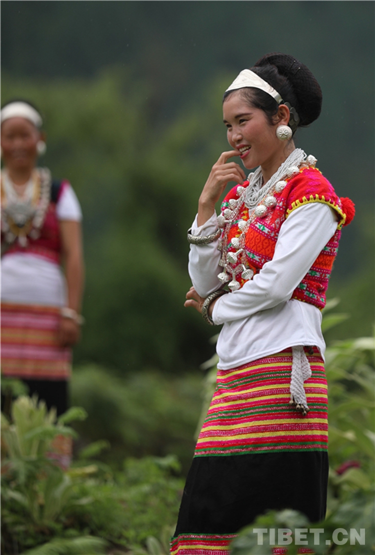 僜人婦女飾品極富特色,頭飾挽發(fā)髻盤于頭頂,發(fā)髻上插上雕花銀簪,銀簪垂數(shù)條細銀鏈,前額上方佩帶一種叫“格崩”的長條橢圓形、形似柳葉狀的銀片,上雕有細密的太陽、月亮圖案的花紋。胸前常佩戴三種形狀不同的飾物,一種叫“八紋得剛”,其形核桃般大小,形似燈籠狀,代表吉祥,一般20只左右穿在一起;一種叫“阿仍”,是多根細環(huán)繞在一起的直徑約40厘米的銀圈;另一種是將銀元鑿洞,串連在胸前。而且,僜人婦女普遍喜愛外型粗大、做工精巧的手鐲。