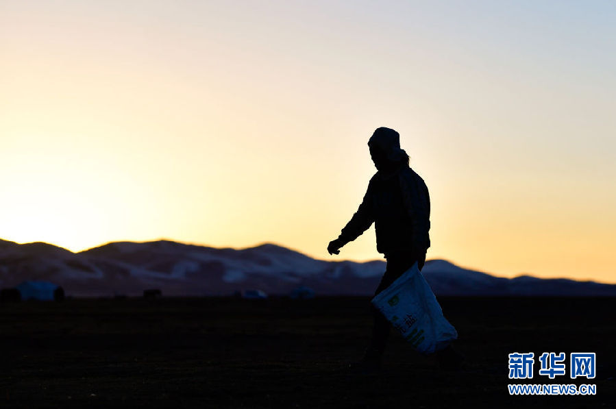 10月28日,在青海省玉樹(shù)藏族自治州稱(chēng)多縣境內(nèi)的嘉塘草原上,生態(tài)管護(hù)員扎西才文在撿拾垃圾。新華社記者 張龍 攝