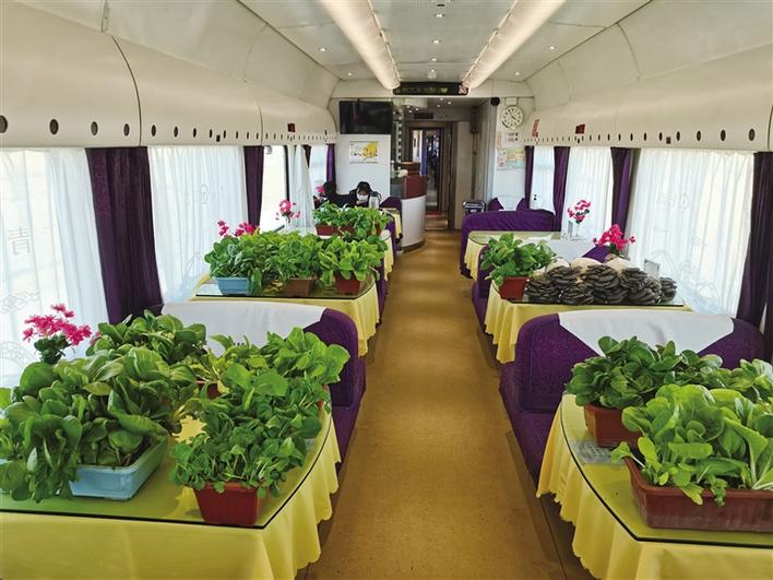 車窗外草原蒼茫,雪山巍峨,車廂里綠意盎然,一盆盆新鮮蔬菜隨著列車,一路西行,自由生長(zhǎng),旅客們吃著原汁原味的“泥土菜”,一路歡歌,一路美景到拉薩。(圖由青藏鐵路集團(tuán)有限公司提供)