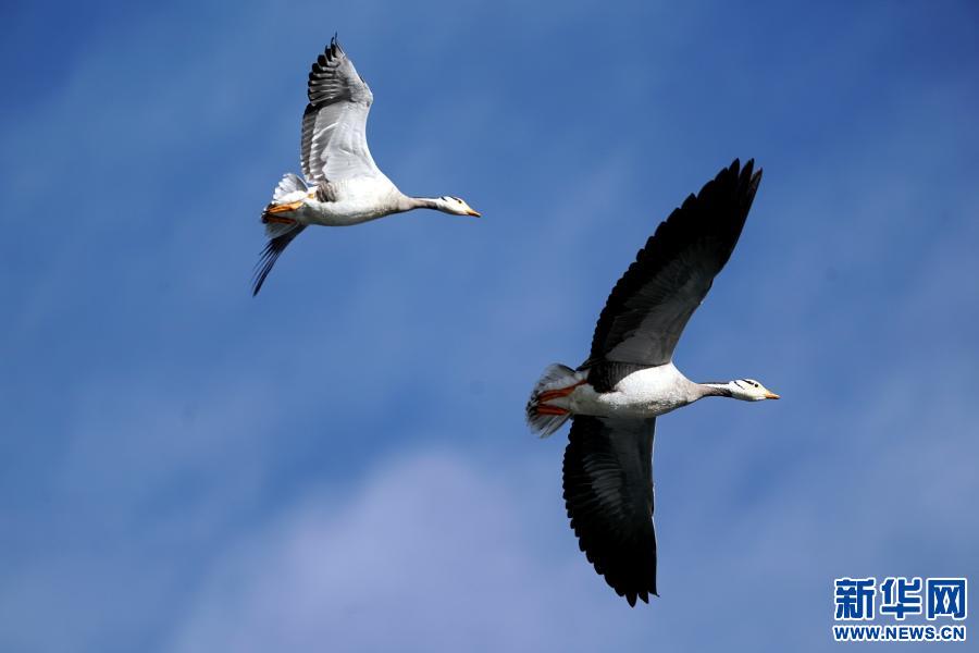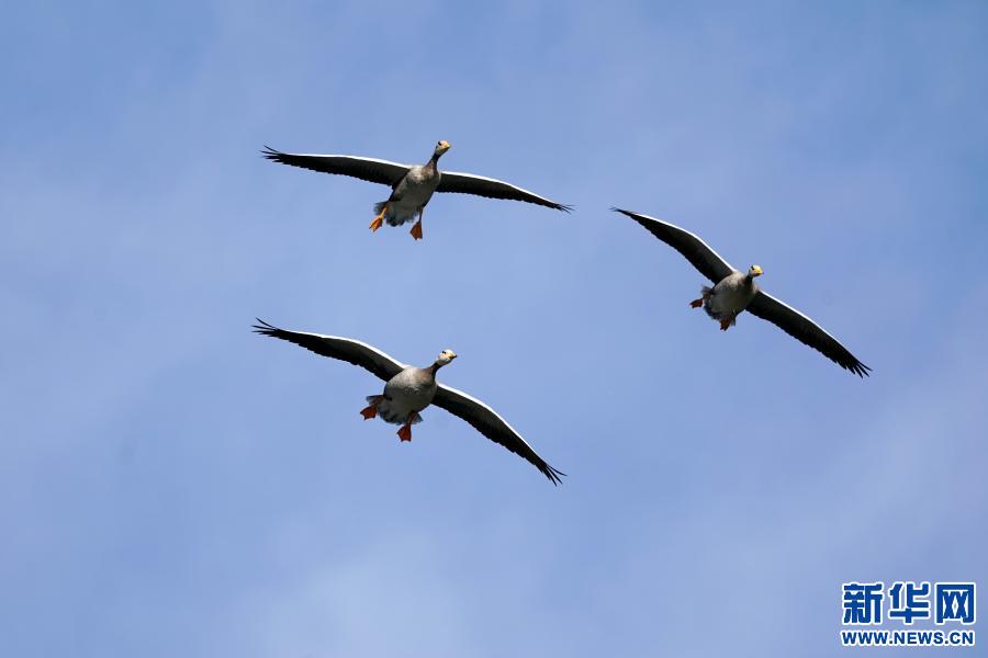 11月23日,斑頭雁在龍王潭公園上空飛翔。新華社記者 詹彥 攝