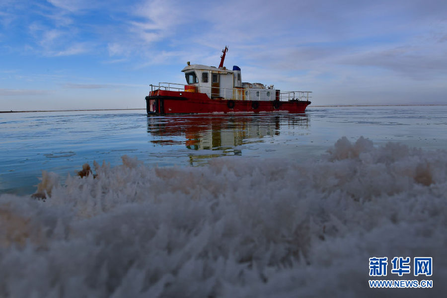 一艘工作船行駛在察爾汗鹽湖內(nèi)(11月27日攝)。新華社記者 張龍 攝