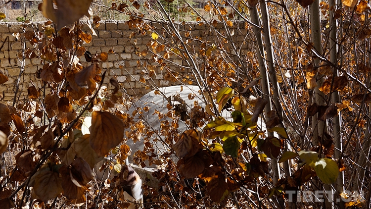 小土坡的東側(cè),土墻圍起一個(gè)方形區(qū)域,眼睛穿過(guò)黃葉,被樹(shù)木圈起的圓堡形墳冢,安葬的是旺青多杰的父親——龔海青。
