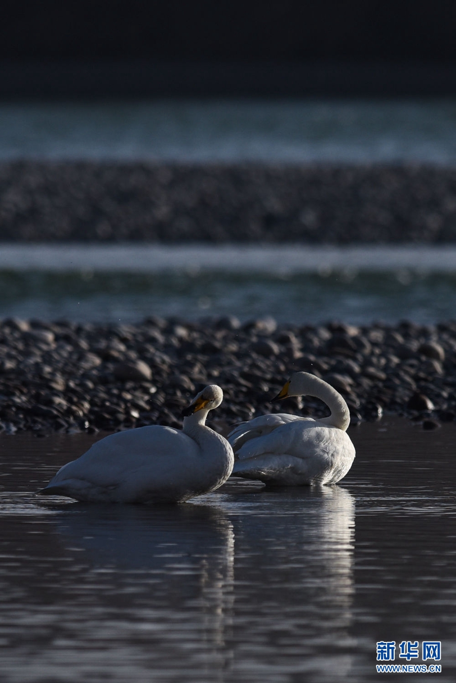 12月11日,幾只大天鵝在青海省貴德縣境內(nèi)的黃河里嬉戲。新華社記者 吳剛 攝
