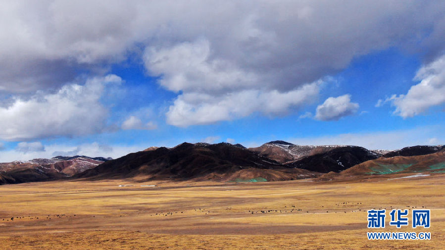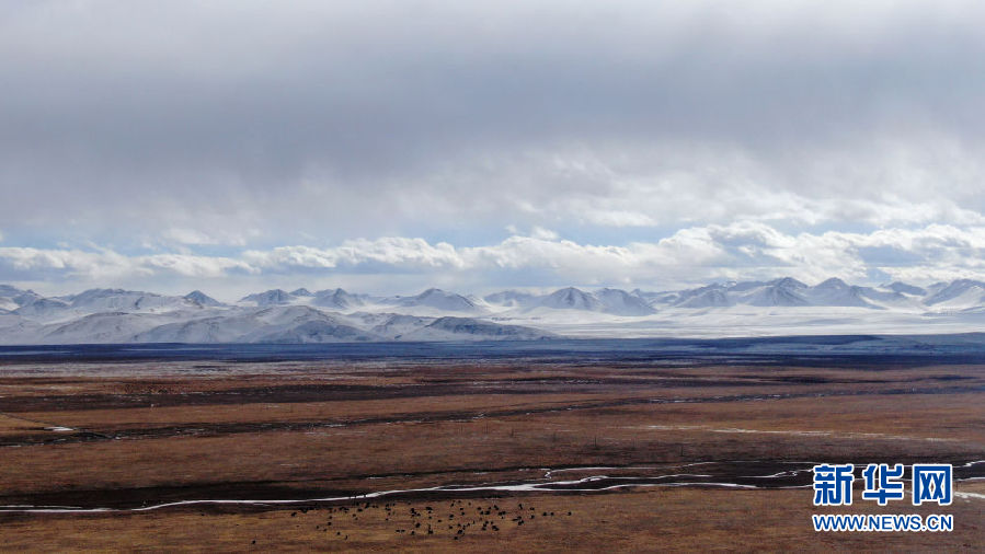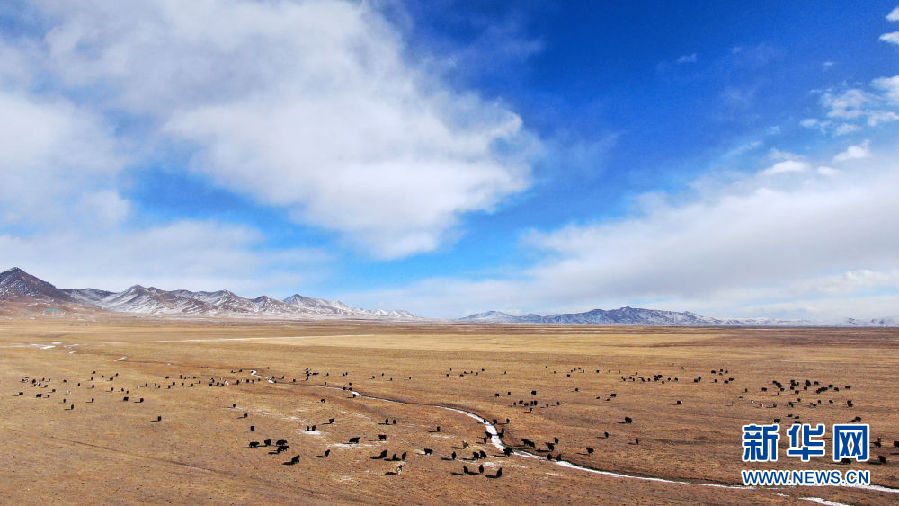 在青海省祁連縣,一群牦牛在草原上活動(12月10日攝,無人機(jī)照片)。新華社記者 張宏祥 攝