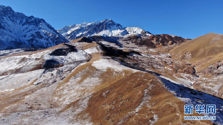 在青海省祁連縣,羊群在雪山下的草原上活動(12月8日攝,無人機(jī)照片)。新華社記者 張宏祥 攝