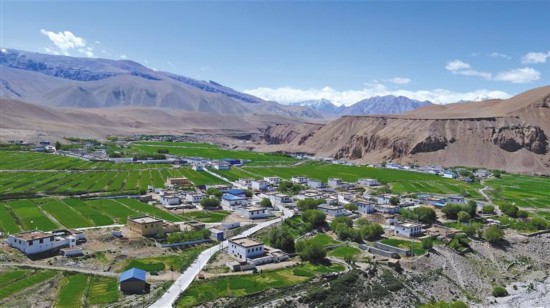 順著巍巍納木那尼山腳一路向著南方前行,幾經(jīng)盤旋,快到普蘭縣城之際,矗立在孔雀河谷之上的一大片平整坡地映入了眼簾,坡地上潔白的屋舍、綠色的青稞、成片的樹林,還有黃色的油菜花構(gòu)成了一幅仿佛油畫般的田園美景。