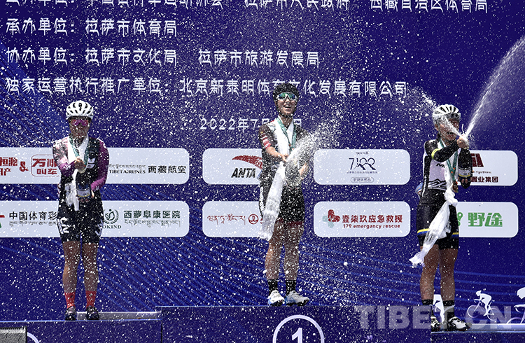 圖為7月23日,2022環(huán)拉薩城自行車大賽山地自行車女子公開(kāi)組前三名高艷嬌(中)、何艷(左)、宋寒冰(右)在頒獎(jiǎng)儀式上開(kāi)香檳慶祝 攝影:王媛媛