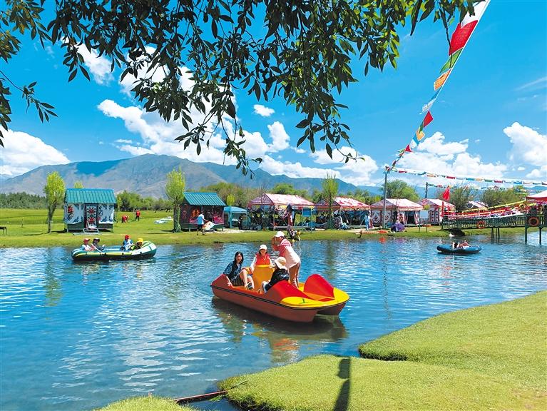 時下,正是“過林卡”的最好時節(jié),為了吸引客源、招攬生意,林卡經(jīng)營者不斷完善基礎(chǔ)設(shè)施,搭建漂亮的帳篷,提供特色服務(wù),滿足市民游客戲水、劃船、健身運動和特色美食等需求?!?/p>