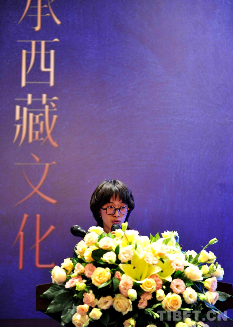 圖為第九屆“地球第三極·西藏禮物”旅游文創(chuàng)商品大賽頒獎儀式現(xiàn)場銀獎獲得者——西藏三界文化發(fā)展有限公司的格桑卓瑪作為獲獎代表進行發(fā)言攝影:拉姆