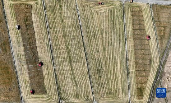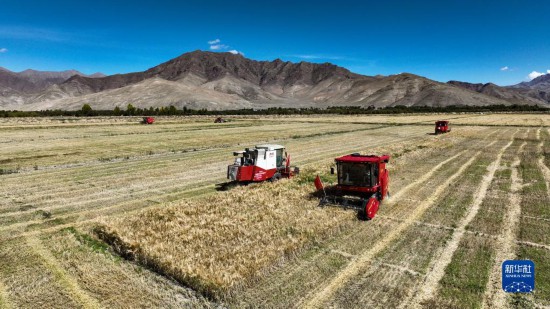 西藏日喀則市江孜縣熱索鄉(xiāng)努康村農機合作社的村民集中對村里三千多畝耕地進行機械化收割(9月19日攝,無人機照片)。記者 晉美多吉 攝