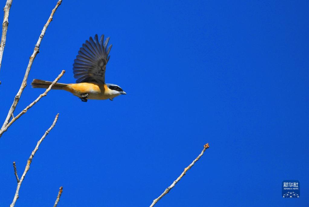 灰背伯勞在拉薩市城關(guān)區(qū)蔡公堂街道次角林村上空飛過(5月14日攝)。新華社記者 張汝鋒 攝