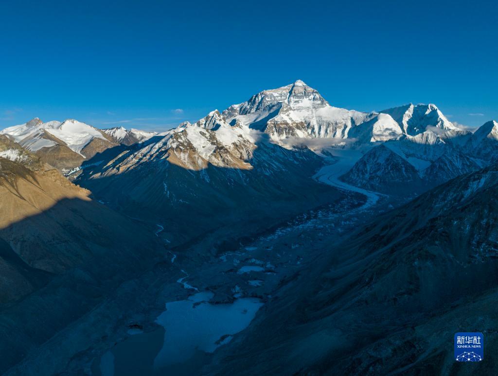 這是日落時(shí)分的珠峰和絨布冰川(5月16日攝,無(wú)人機(jī)照片)。新華社記者 孫非 攝