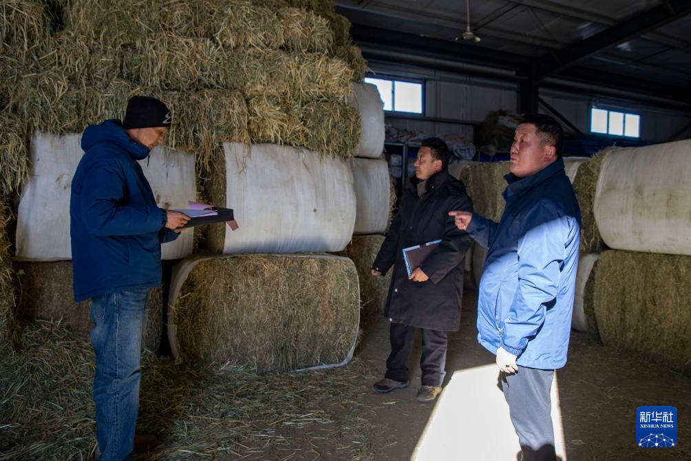 當(dāng)?shù)馗刹吭诙砭绵l(xiāng)農(nóng)牧業(yè)防抗災(zāi)物資儲(chǔ)備庫(kù)里盤點(diǎn)物資庫(kù)存。這里草料、爐子、棉服、煤炭、除雪工具等一應(yīng)俱全(12月18日攝)。新華社記者 姜帆 攝