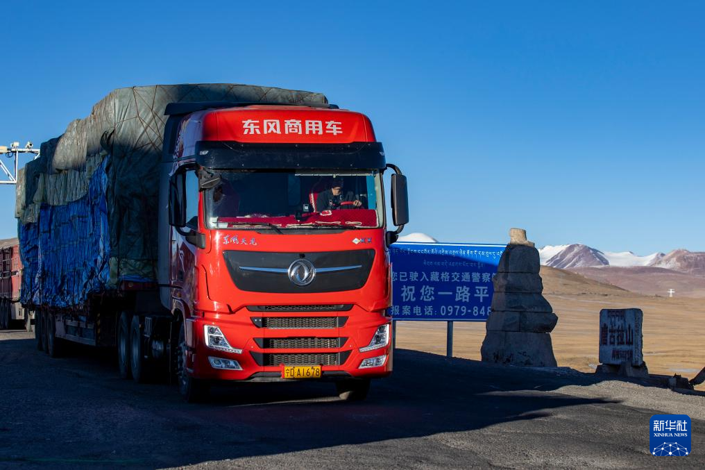 申扎縣供銷合作社從西寧采購(gòu)新鮮果蔬的貨車經(jīng)過唐古拉山口(1月3日攝)。 新華社記者曹檳 攝