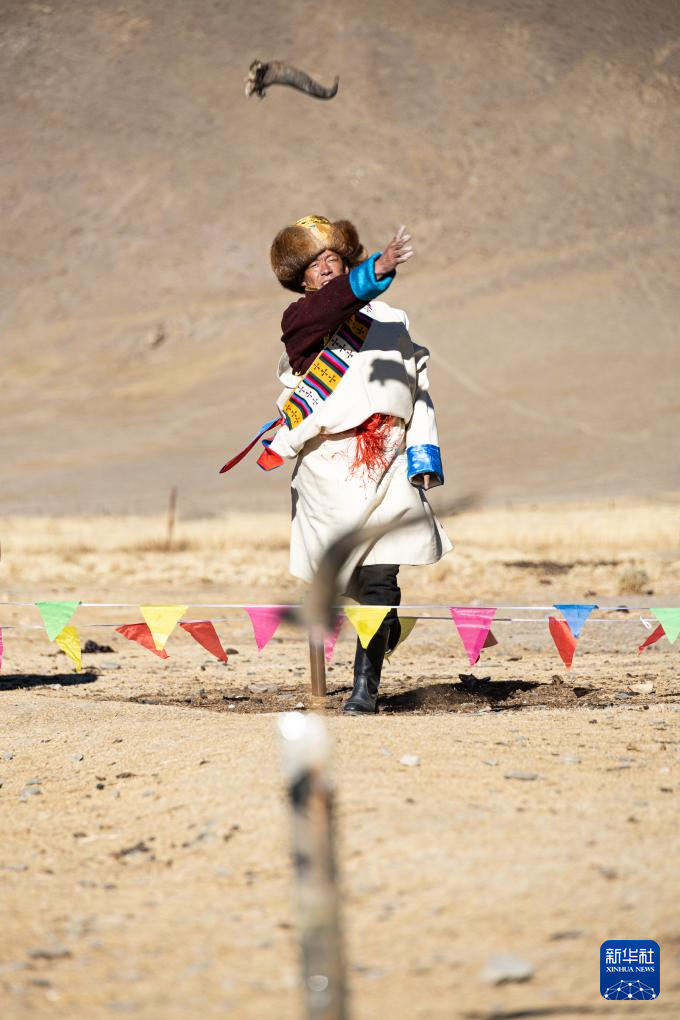 思古龍村的一位村民在投擲牛角(1月13日攝)。新華社發(fā)(丁增尼達 攝) ??