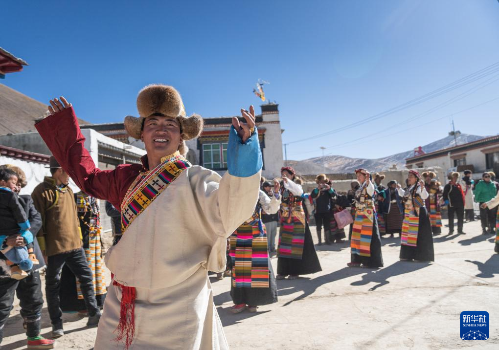思古龍村的村民們在跳鍋莊舞(1月13日攝)。新華社發(fā)(丁增尼達 攝) ??