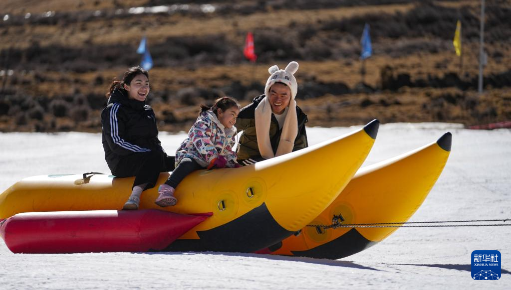 1月13日,游客在墨多滑雪場體驗香蕉船嬉雪項目。新華社記者 晉美多吉 攝 ??