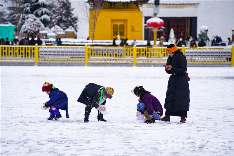 第四站,布達(dá)拉宮廣場?!敖o我一瓶礦泉水,我能還你兩座布達(dá)拉宮?!北绕鹗裁磿r(shí)候都可以在這里拍的布達(dá)拉宮倒影,雪中的布達(dá)拉宮廣場可謂是“可遇不可求”。南方的游客在這里激動地高喊“我終于見到雪了”,北方的游客抖抖肩膀上的雪花繼續(xù)拍攝下一組寫真,本地的藏族娃娃和小伙伴們一起追逐嬉戲,雪中的西藏和平解放紀(jì)念碑顯得更加巍峨。