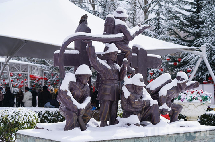 第二站,銅牛廣場。銅牛廣場位于布達(dá)拉宮西南方向約300米處,北京中路與林廓西路在此相交。這里是開放式的人行道,非常開闊,是通往布達(dá)拉宮廣場的必經(jīng)之路,很多人都在此合影留念。雪中的銅牛披上了白色的“外衣”,更加體現(xiàn)出“憨厚、忠誠、悲憫、堅(jiān)韌、勇悍、盡命”的牦牛精神。