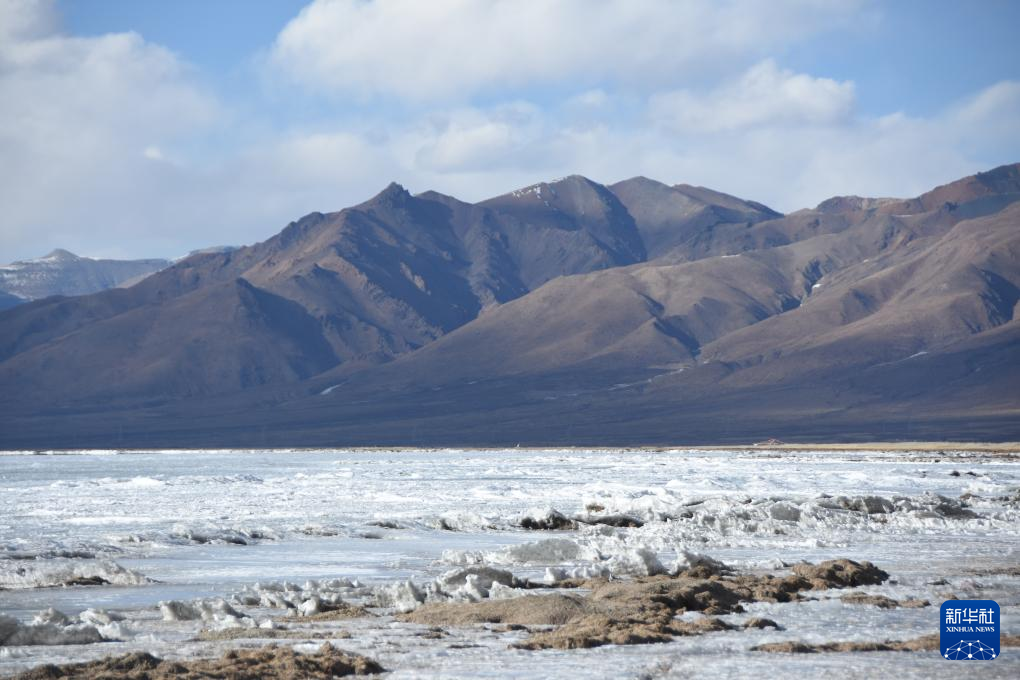 瑪旁雍錯湖面上的冰堆積在一起,形似波浪(1月29日攝)。新華社記者 關明輝 攝 ??