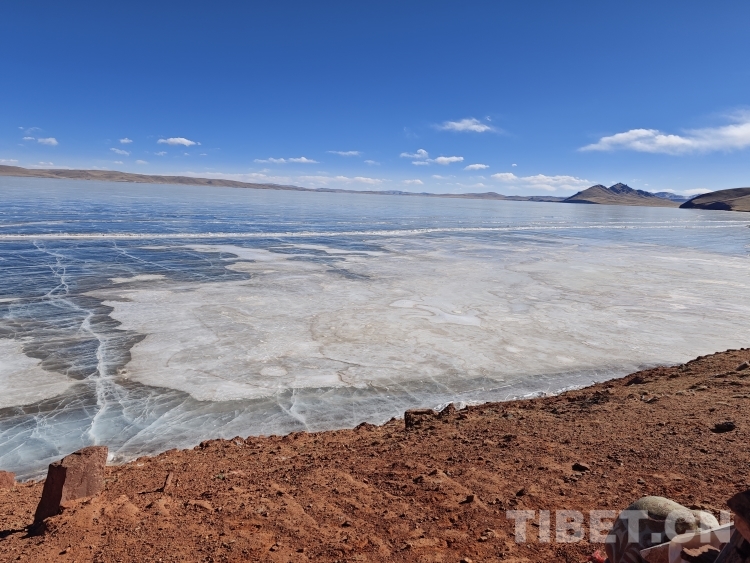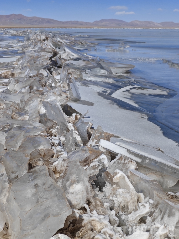 錯(cuò)那湖湖面海拔4600米左右,面積400多平方公里,是世界上海拔最高的淡水湖,更有冰泡、冰裂、冰推等奇妙的自然景觀。當(dāng)氣溫急劇下降時(shí),水溫也驟降,湖底產(chǎn)生的氣體在上升過程中被凍在冰中,形成許多細(xì)小的白色氣泡,懸浮在厚厚的冰層之中。湖水表面一層被藏北的朔風(fēng)快速凍結(jié)成冰,部分碎冰在岸邊堆積,形成隆起的“冰岸線”。又由于初春晝夜溫差較大,湖冰崩裂,形成網(wǎng)狀的冰裂紋路。這些透明裂紋從岸邊開始,像潮水一樣漫過平地,漫過羌塘草原腹地,漫到天邊,把羌塘大地裝扮成一個(gè)冰晶縱橫交錯(cuò)的世界。(中國西藏網(wǎng)文/李一凡 張萌萌 龍真多吉)
