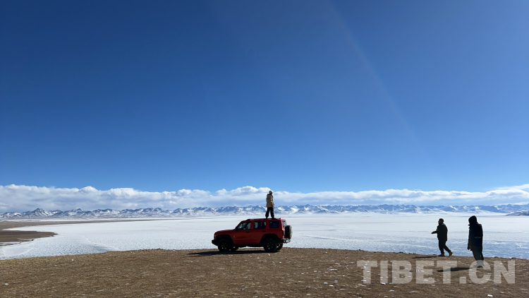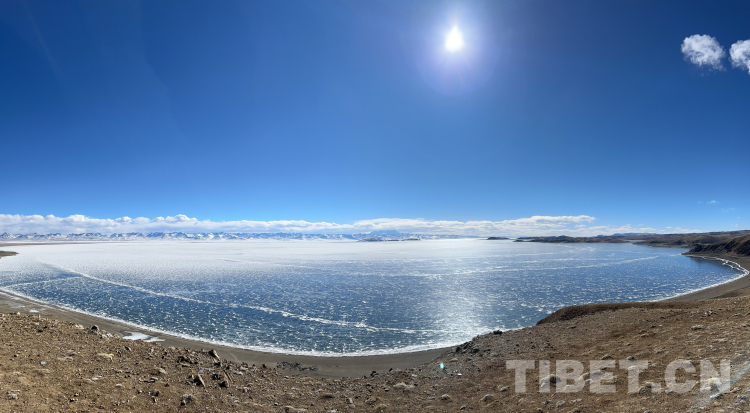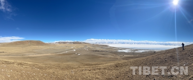 爬上一座山丘,視野陡然明亮開(kāi)闊起來(lái)。原本土黃色的藏北天然牧場(chǎng)高低起伏,黑牦牛零星地散落在山坡,登上高處后,天際圣境納木錯(cuò)便映入眼簾。初春時(shí)節(jié)的拉薩依然春寒料峭,納木錯(cuò)的落雪還未完全消融,站在高處俯視,這片安靜的大湖被陽(yáng)光反射得白茫茫一片。更幸運(yùn)的是碰到了晴好的天氣,白云與湖冰相襯,亦與遠(yuǎn)山相接,視線盡頭的念青唐古拉山脈直視無(wú)礙,畫(huà)面猶如“半池白云半池玉”般頗具美感。