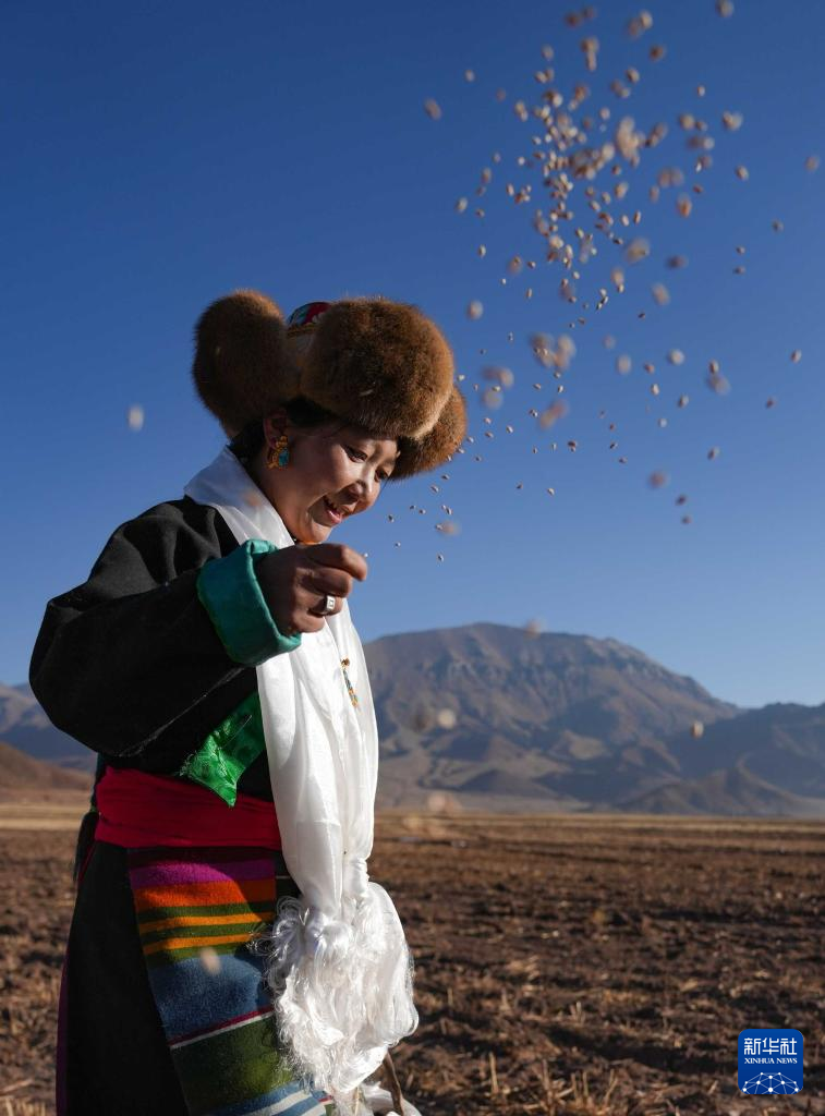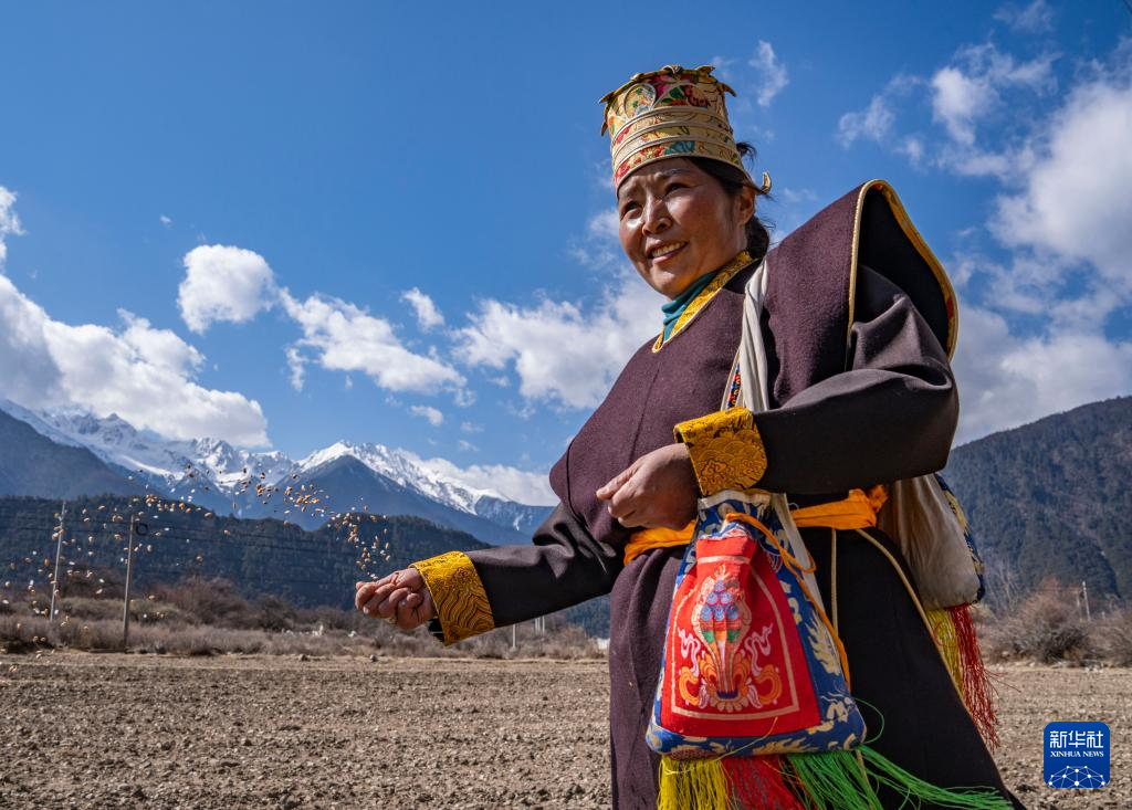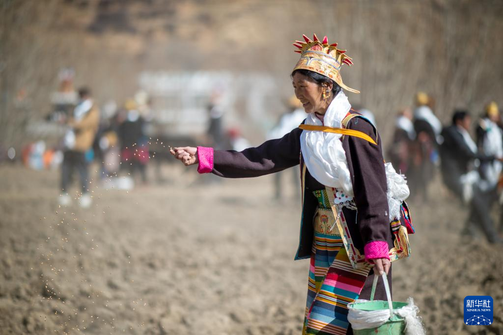 3月16日,在西藏拉薩市林周縣春堆鄉(xiāng)春耕儀式現(xiàn)場,農(nóng)民播撒種子。新華社記者 晉美多吉 攝