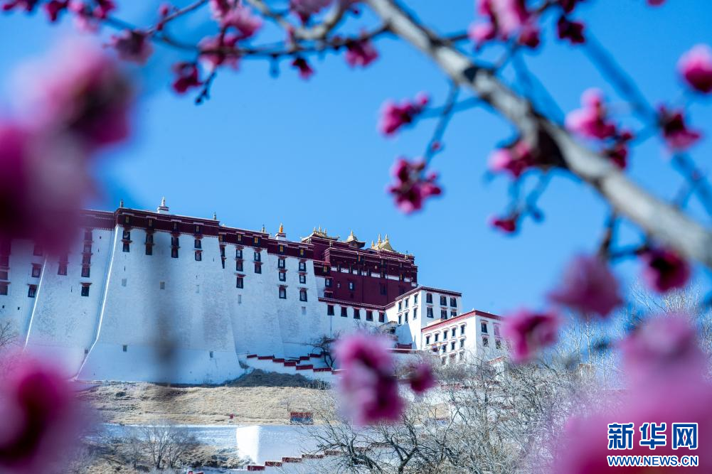 3月15日,杏花映襯下的布達(dá)拉宮。新華網(wǎng) 旦增努布 攝