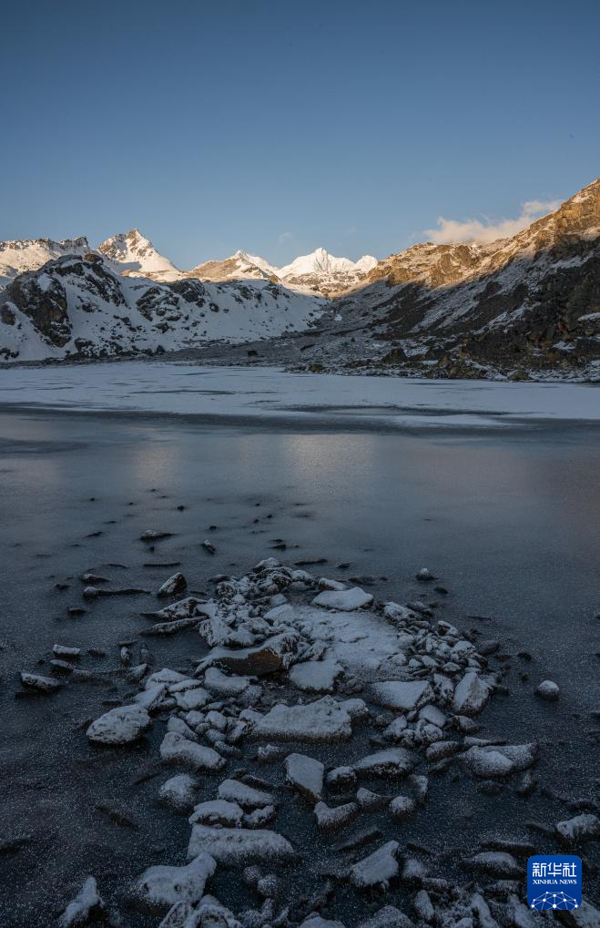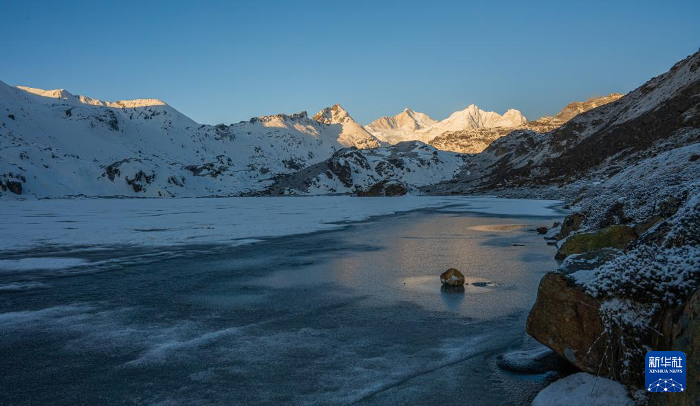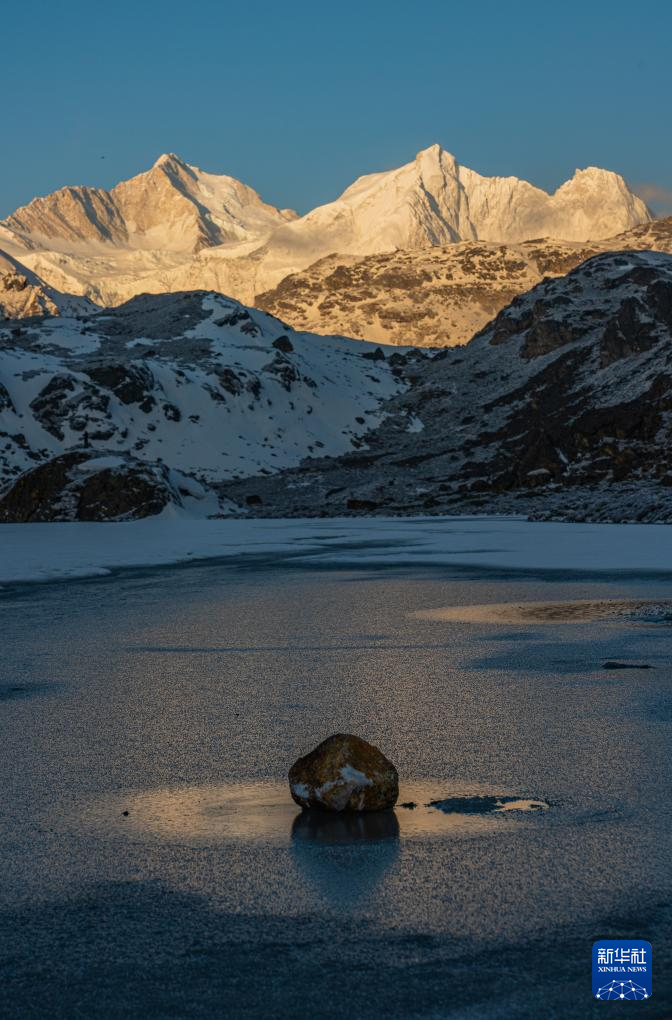 4月17日,晨光照耀嘎瑪溝及遠處的喜馬拉雅山脈,清晨的第一縷陽光與雪山相映成趣,形成“日照金山”景象。