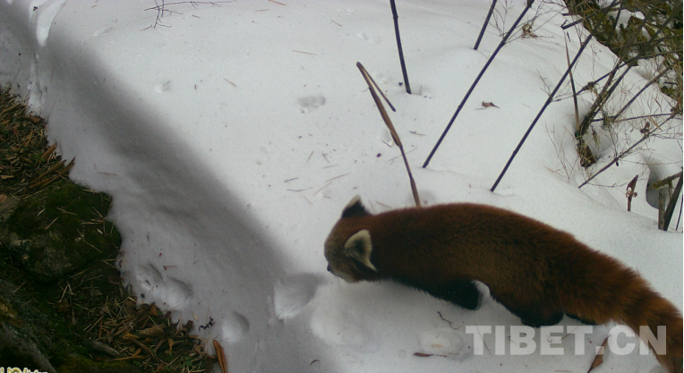 此外,紅外相機精準拍到了一只赤麂(國家重點保護野生動物名錄二級)正穿梭叢林的畫面,它臉部較狹長,額部V字形黑紋特別明顯,四肢細長,額頂?shù)南鄳课晃⒂型黄?,并有成束的黑毛。在不同的地點還拍到了喜馬拉雅小熊貓(國家重點保護野生動物名錄二級)的覓食畫面。