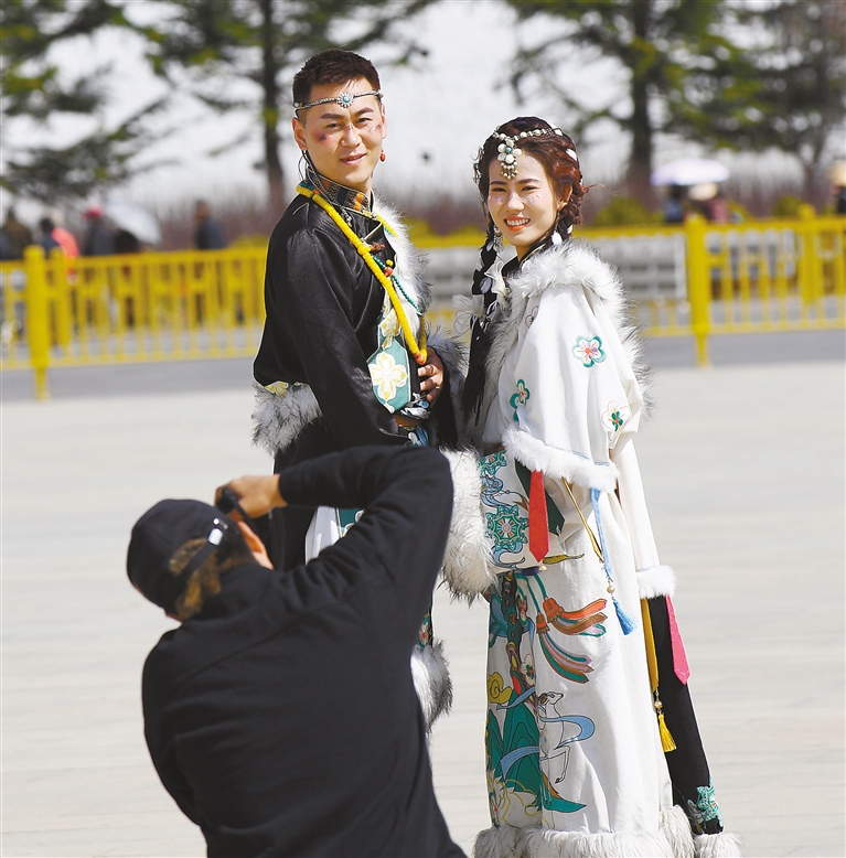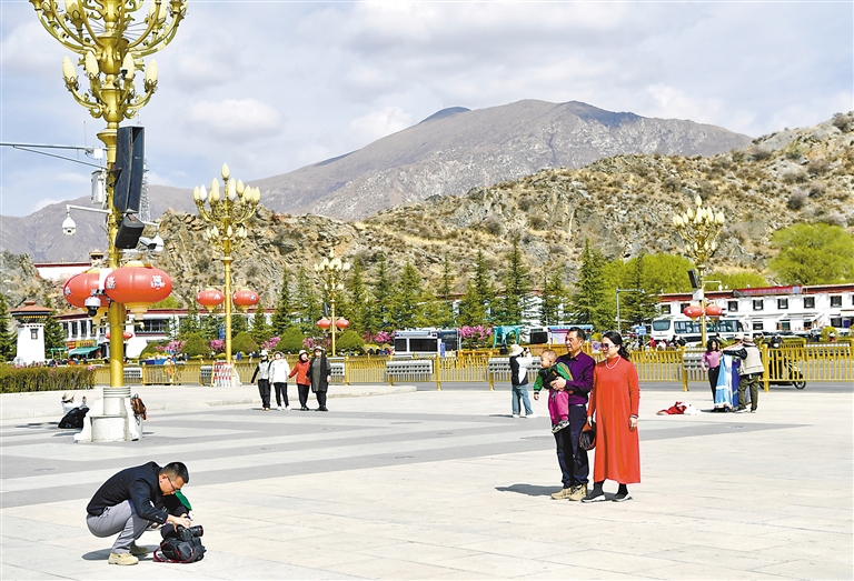 在布達拉宮廣場合影的游客。記者 王敏 攝