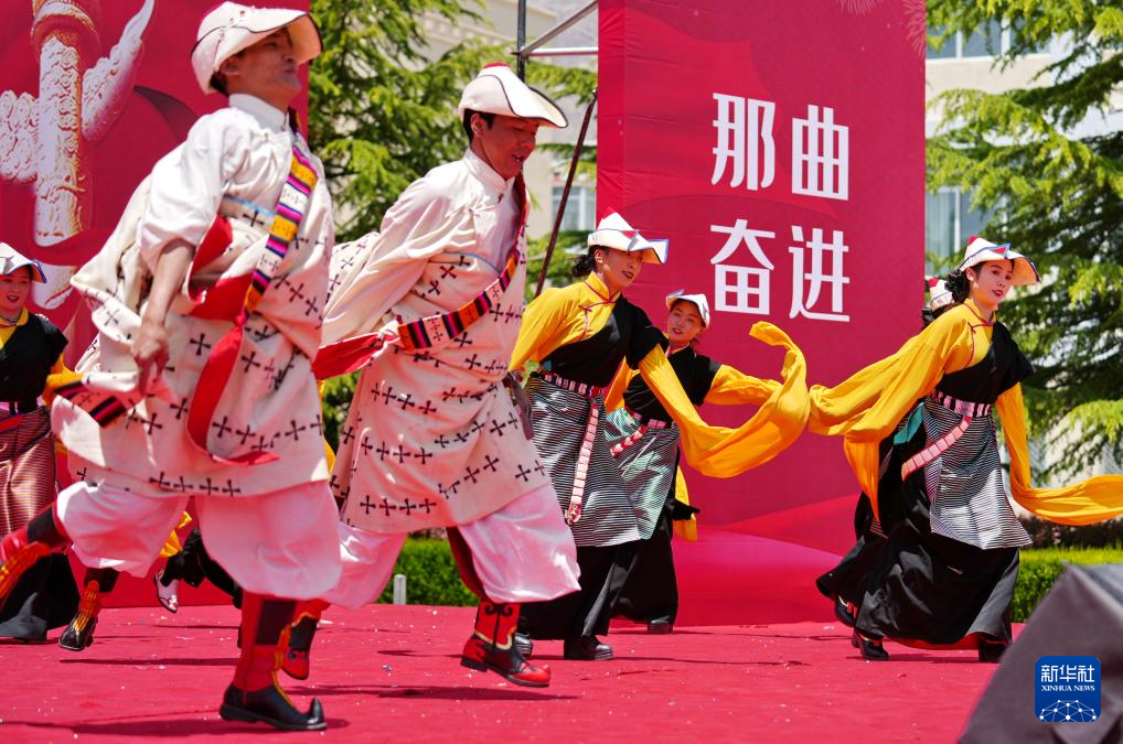 5月12日,在西藏職業(yè)技術(shù)學(xué)院職業(yè)教育活動(dòng)周啟動(dòng)儀式暨比如縣非物質(zhì)文化遺產(chǎn)進(jìn)校園活動(dòng)上,比如縣民族藝術(shù)團(tuán)的演職人員在表演節(jié)目。新華社記者 張汝鋒 攝 ??