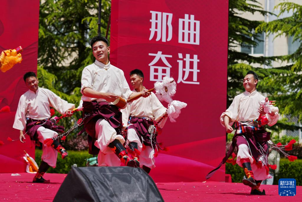 5月12日,在西藏職業(yè)技術(shù)學(xué)院職業(yè)教育活動(dòng)周啟動(dòng)儀式暨比如縣非物質(zhì)文化遺產(chǎn)進(jìn)校園活動(dòng)上,比如縣民族藝術(shù)團(tuán)的演職人員在表演節(jié)目。新華社發(fā)(趙大志攝) ??