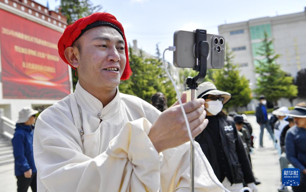 ?5月12日,在西藏職業(yè)技術(shù)學(xué)院職業(yè)教育活動(dòng)周啟動(dòng)儀式暨比如縣非物質(zhì)文化遺產(chǎn)進(jìn)校園活動(dòng)上,來自比如縣的一名旅游推介者在做現(xiàn)場(chǎng)直播。新華社記者 張汝鋒 攝 ??
