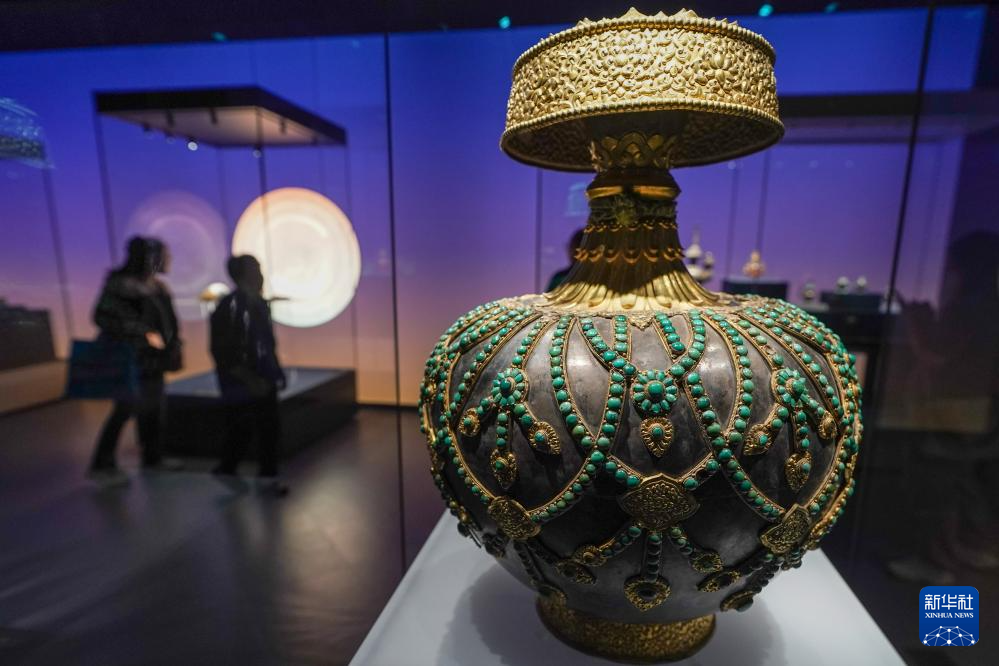 5月11日,“布達拉宮——來自雪域的世界文化遺產(chǎn)”展覽現(xiàn)場展出的“銀質(zhì)嵌松石瓔珞尊勝瓶”。新華社記者 李博 攝