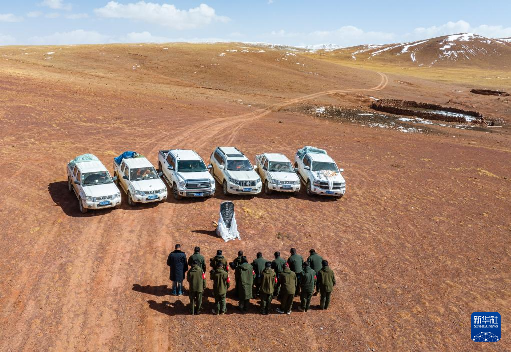野生動物專業(yè)管護隊員在無人區(qū)深處的羅布玉杰烈士紀念碑前默哀致敬。羅布玉杰2002年在與盜獵分子的槍戰(zhàn)中犧牲(無人機照片,5月10日攝)。新華社記者 姜帆 攝