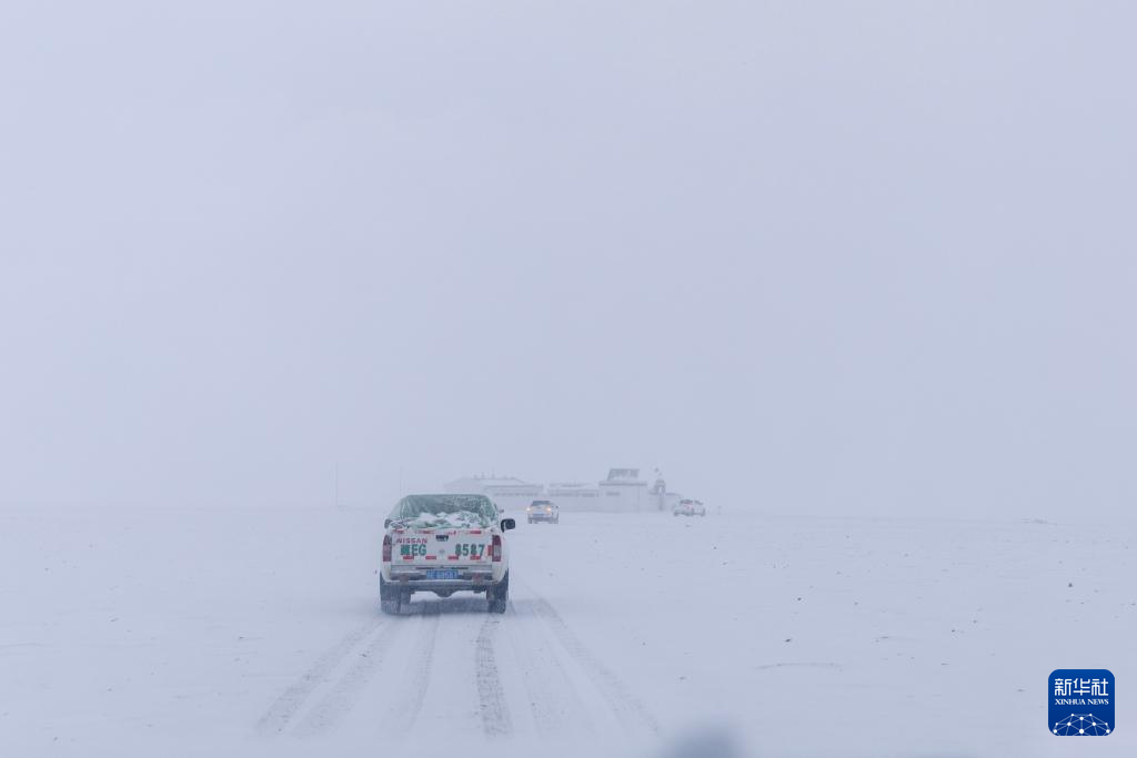 ??野生動物專業(yè)管護隊員的車隊在大雪中巡護(無人機照片,5月8日攝)。新華社記者 丁增尼達 攝