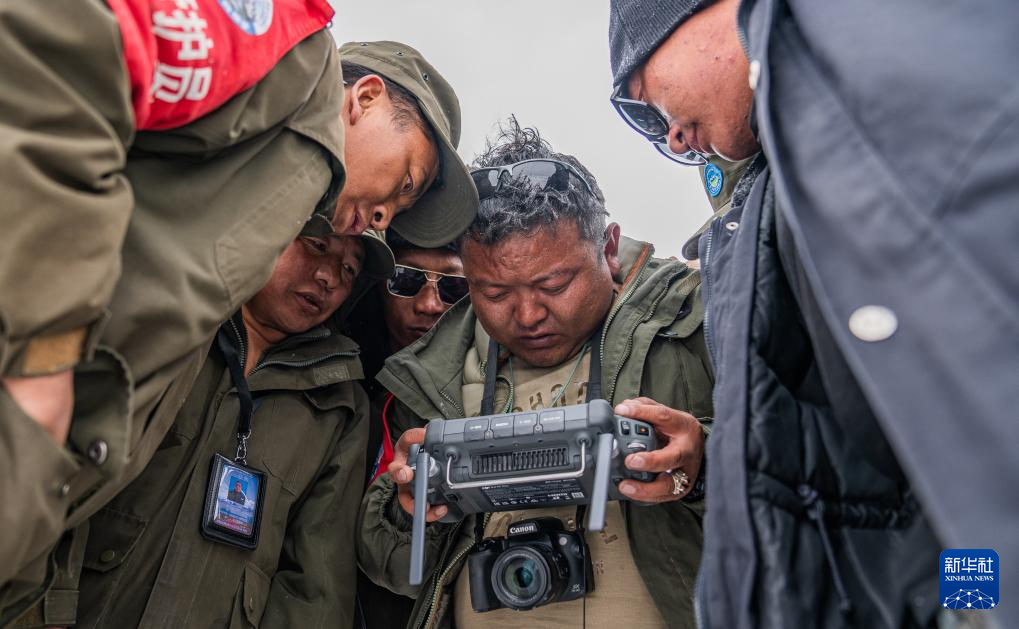 ??羅布玉杰管護站站長格桑倫珠(右二)和隊員們在大雪中操作無人機觀察藏羚羊遷徙情況(5月10日攝)。新華社記者 丁增尼達 攝