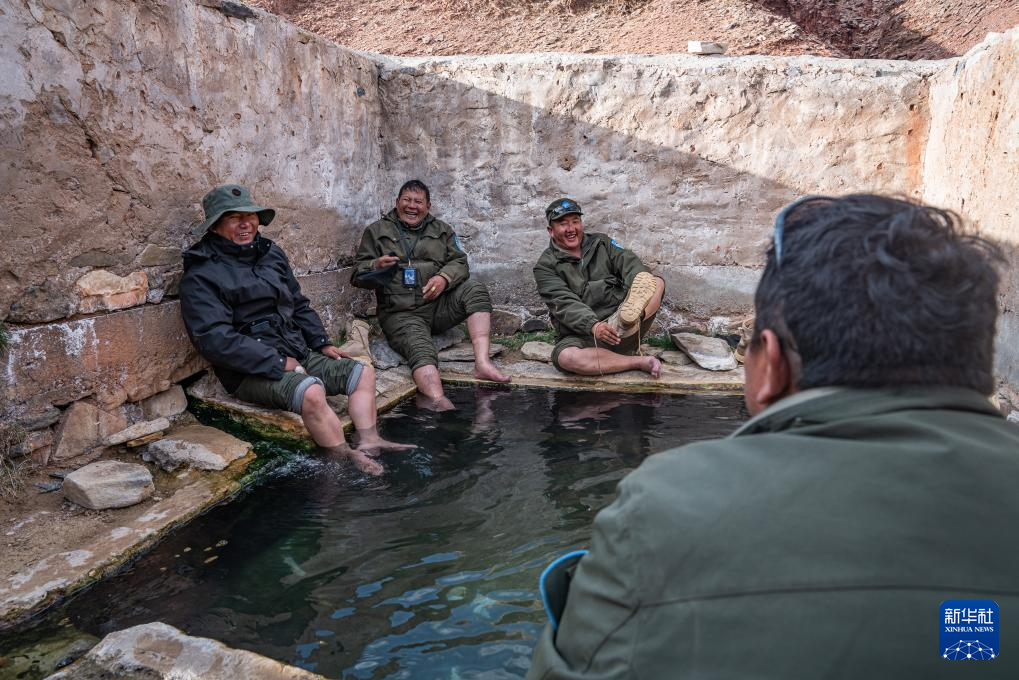 ??野生動物專業(yè)管護隊員們在一處廢棄的溫泉池中泡腳休息(5月8日攝)。新華社記者 丁增尼達 攝